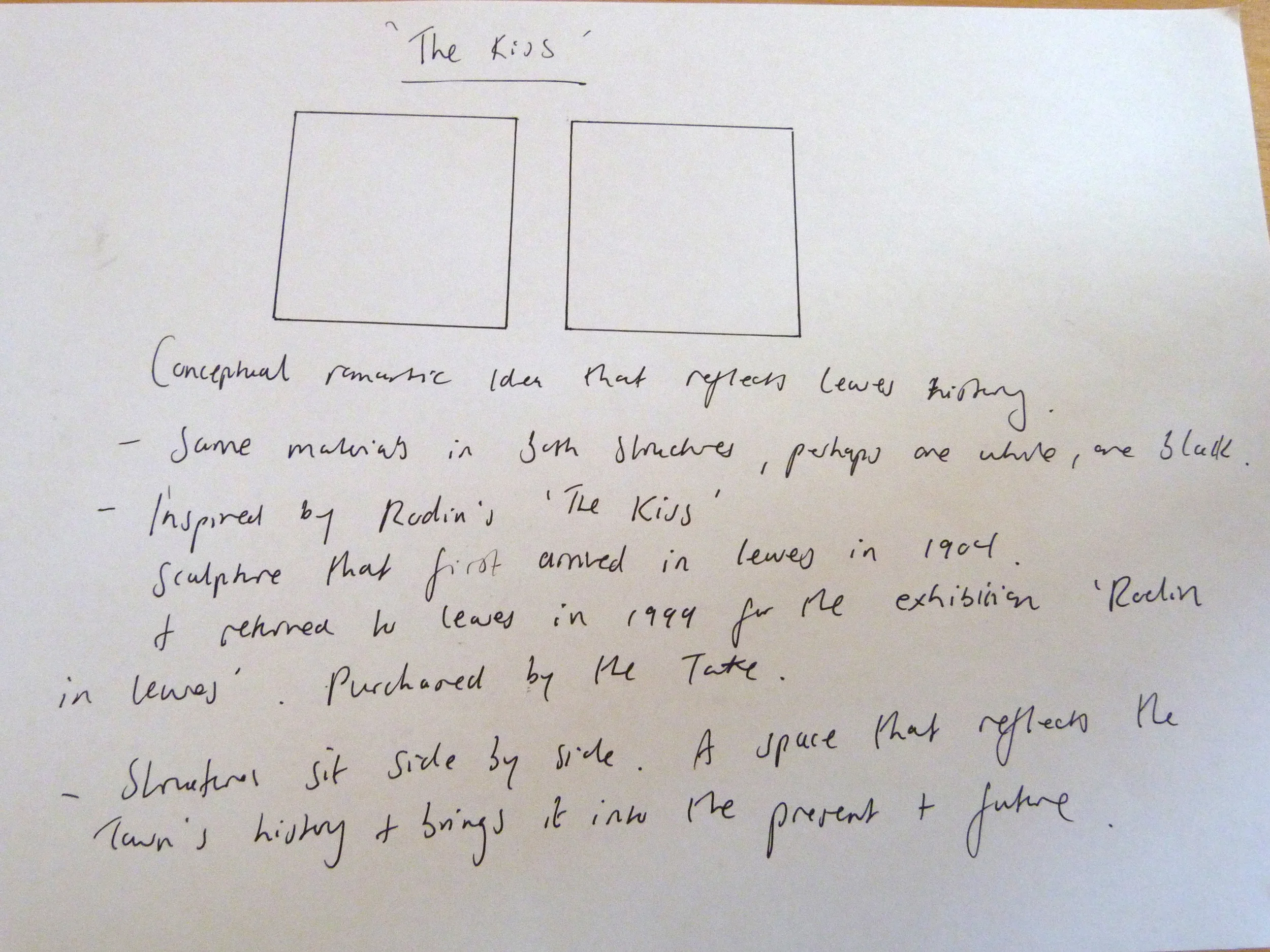 Inspired by Rodin's 'the kiss', which was on display at lewes for quite a long period and has now become a personal sculpture to lewes. I propose that the two structures would sit side by side, the same material but different colours? (in the pictures i have attached i suggested corrugated iron which would give more of an industrial quality that lewes holds in contrast to the romantic concept of the kiss sat side by side, or perhaps cement and wood board which would reflect the towns naturalistic elements) A space that reflects the towns history and brings it into the present and future. By not over complicating the design or by use of materials drawing on more conceptual considerations and minimal materials may allow the people of lewes to appreciate the space itself and the space that surrounds the structure. I was thinking the space created could be used for students or emerging artists around the city to show their work for a short period as a pop up exhibition, this could open the event as a private view bringing people together. I also really like the idea of a pop up stall, perhaps a bakery, where the community can gather together and learn to bake. I have also attached some images (think the last two images) which was a previous project i did, that was based around space. I created a replica of the same room it was shown in, and then artists showed their work inside instead of the "actual room". This project helped me to consider the concept of space and how we function within it. looking forward to meeting everyone, Rebecca Russell