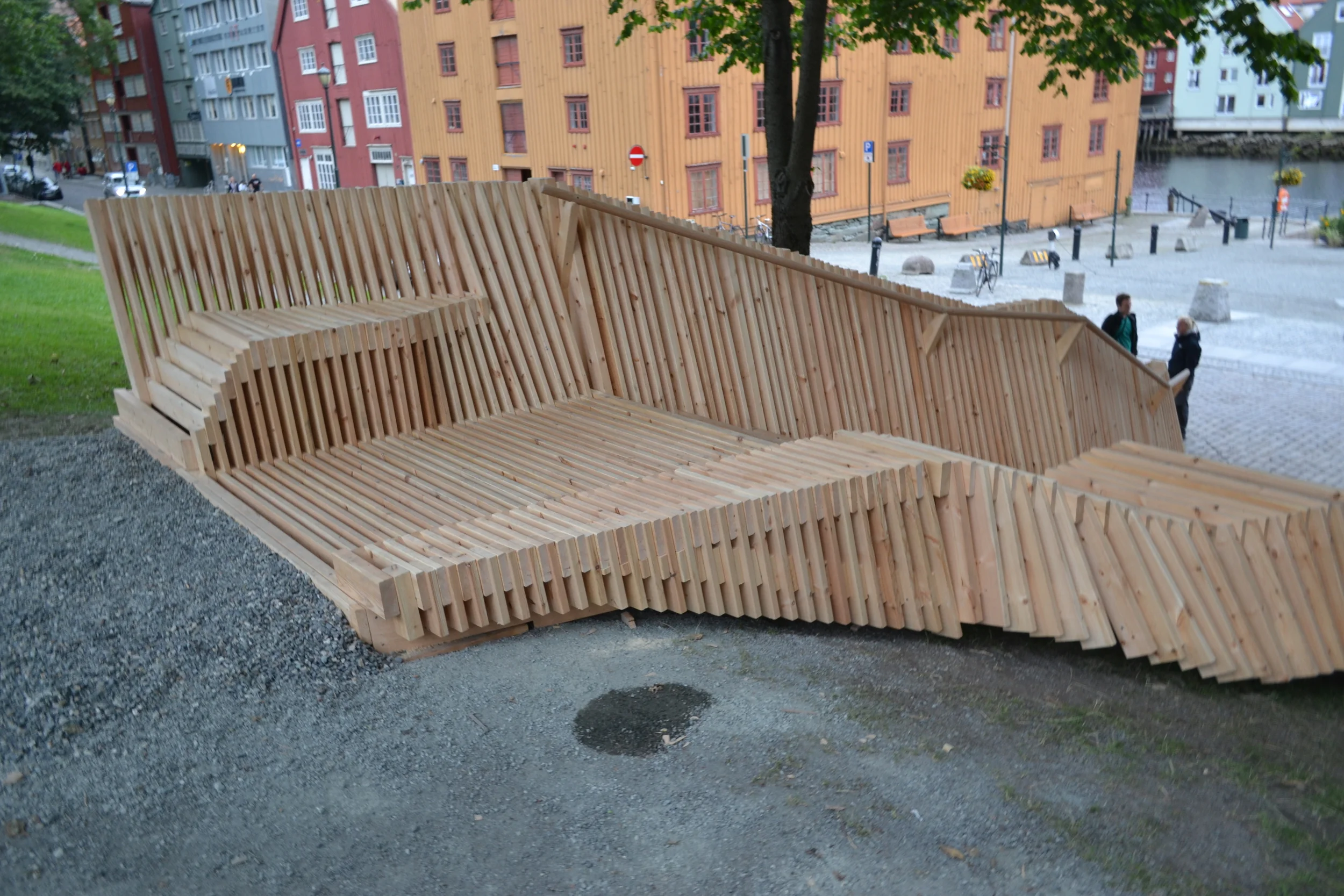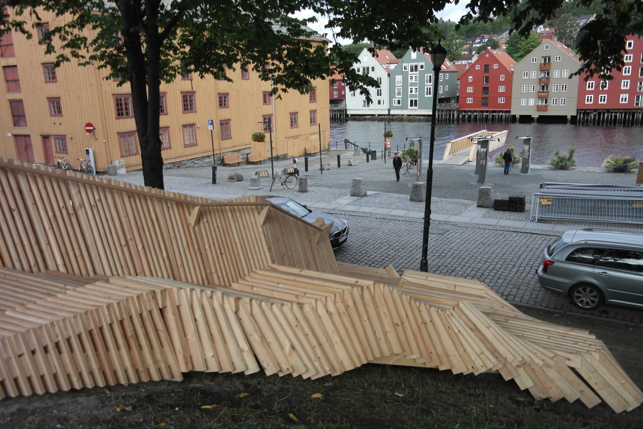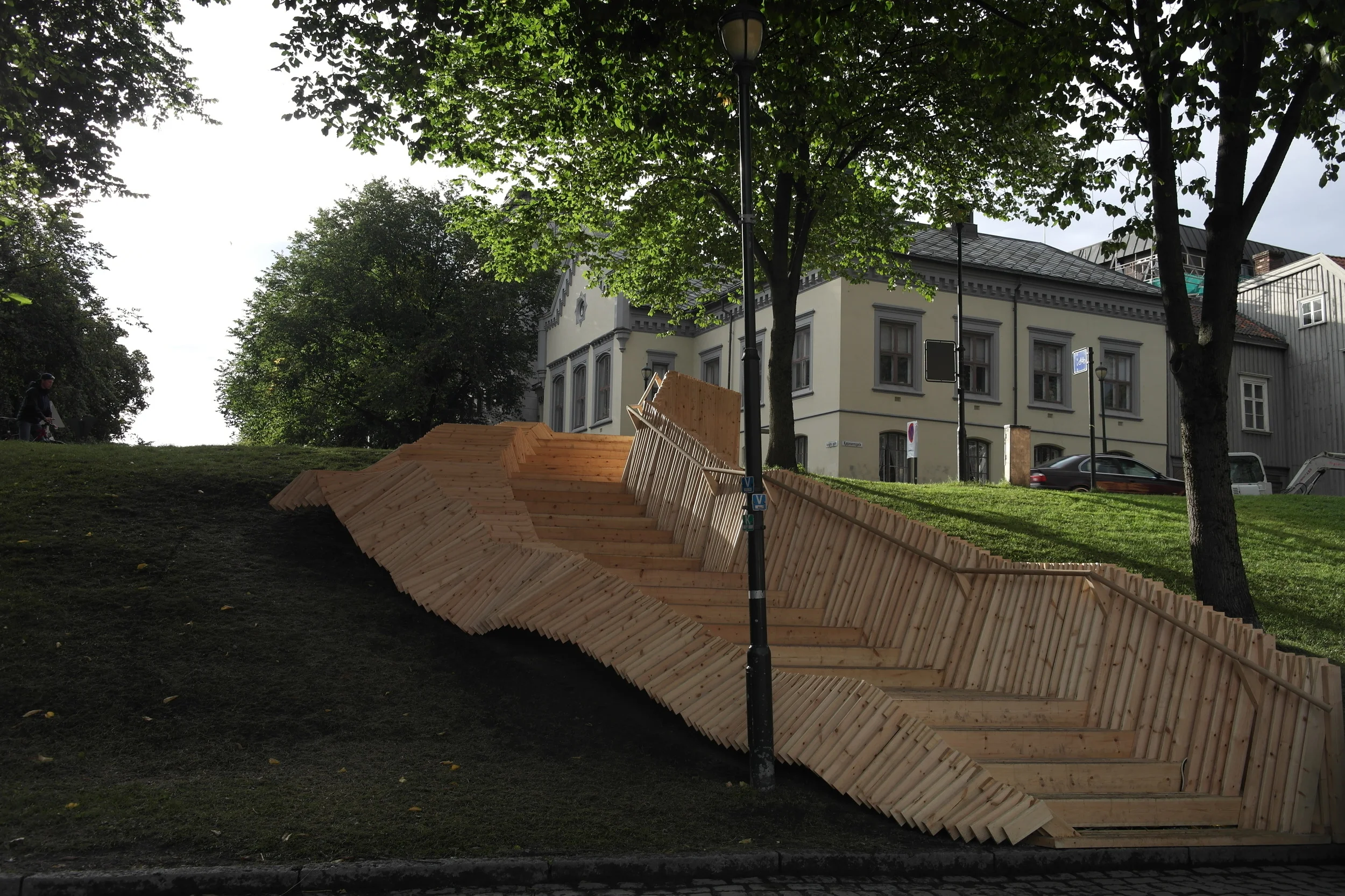 The project's aim was to provide a temporary installation that would improve access from upper and lower part of the Kjøpmannsgata, (re)building a connection across the grass-sloped bank that stands between them.